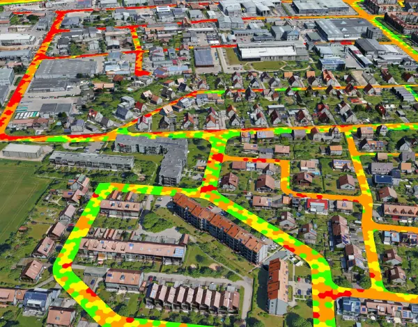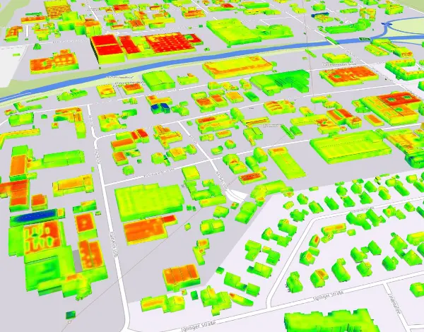 Wir berechnen verschiedene Temperatur-Layer, z. B. für Oberflächentemperaturen, Dachtemperaturen, Objekttemperaturen. Diese Layer lassen sich direkt in bestehende GIS-Systeme oder einen Digitalen Zwilling integrieren.