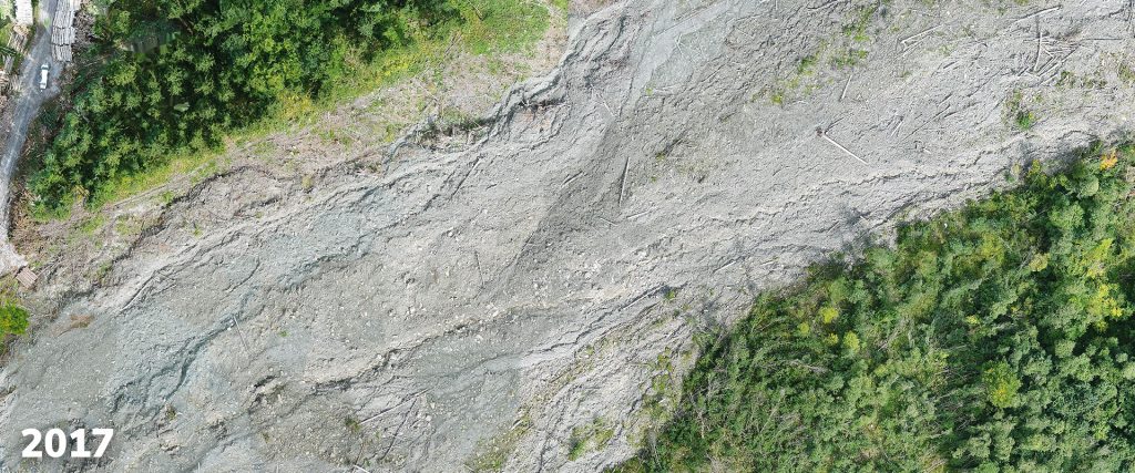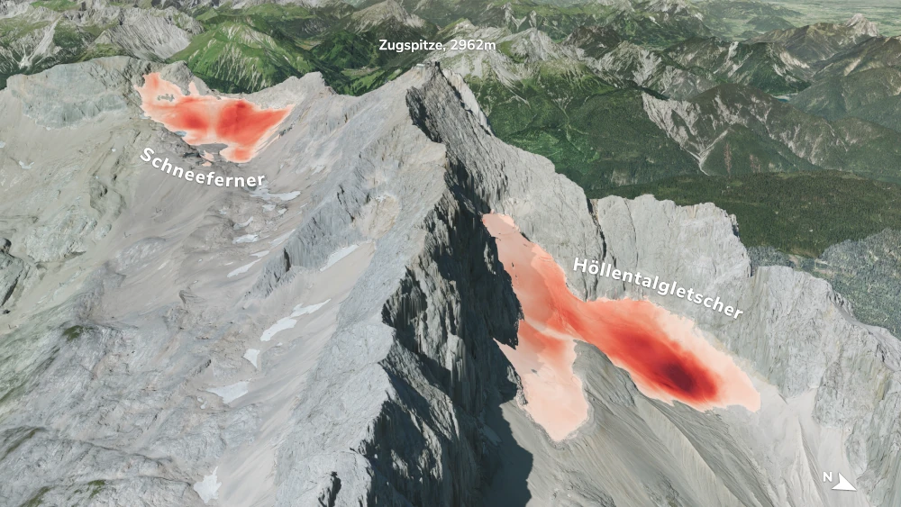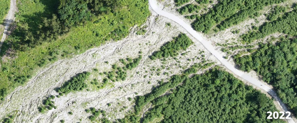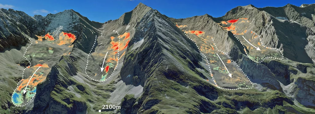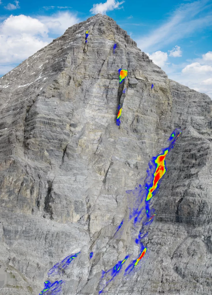 Der Hochvogel (2.592 m) in den Allgäuer Hochalpen an der deutsch-österreichischen Grenze ist seit 2014 aufgrund akuter Steinschlaggefahr von der österreichischen Seite gesperrt. Ein markanter Bruch am Gipfel wird durch ein von TUM-Landslides entwickeltes Frühwarnsystem überwacht, das mithilfe drahtloser Sensoren in Echtzeit die Rissbewegungen misst. Ein möglicher Gipfelkollaps könnte gravierende Auswirkungen auf die umliegenden Täler haben, etwa durch verstärkte Sedimentproduktion und Murgänge. Um diese Prozesse besser zu verstehen, führt RealityMaps seit 2009 regelmäßig hochauflösende UAV-Vermessungen am Gipfel durch. Mithilfe photogrammetrischer Auswertung dieser Bilddaten können Höhenmodelle berechnet, Geländeänderungen dokumentiert und kleine Felsstürze entlang des Südwesthangs identifiziert werden. So lassen sich Spannungszonen erkennen, die auf bevorstehende größere Abbrüche hindeuten könnten. Diese Erkenntnisse dienen der Verbesserung des bestehenden Frühwarnsystems und helfen bei der gezielten Platzierung neuer Messinstrumente.